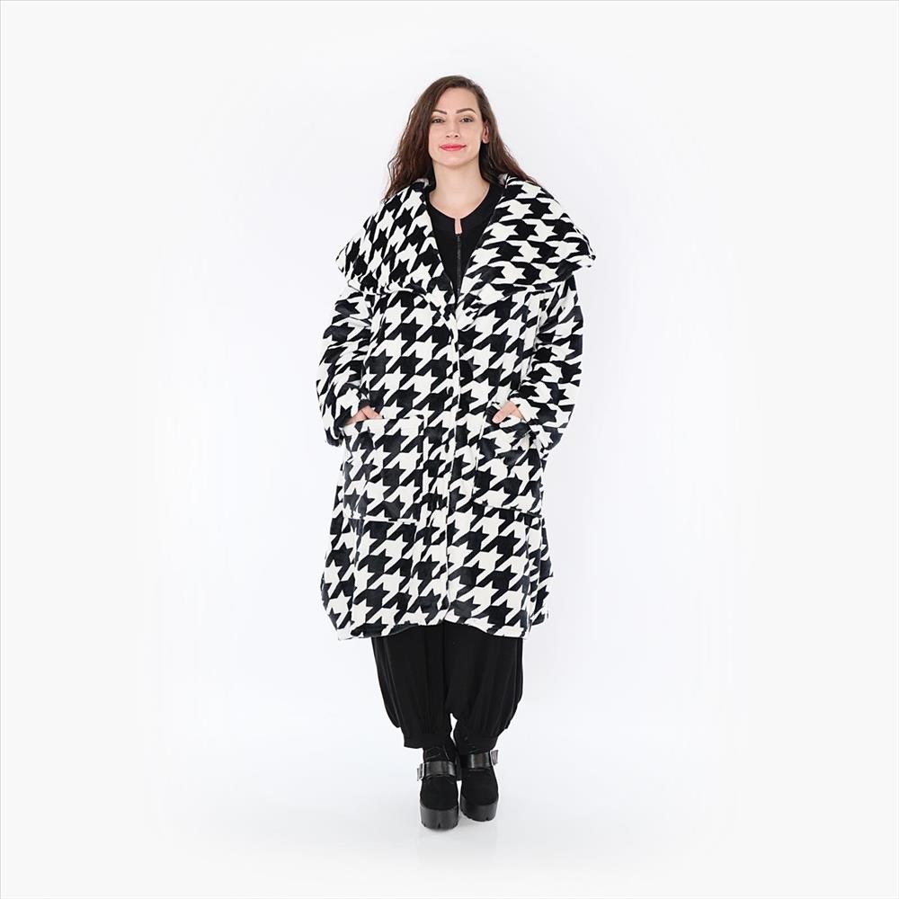Lange Kapuzenjacke mit aufgesetzten Taschen. Das grafische Karomuster ist ein echter Hingucker und lässt sich leicht zu allen Farben kombinieren. Strick Baumwolle, Langarm. – Made in Germany !